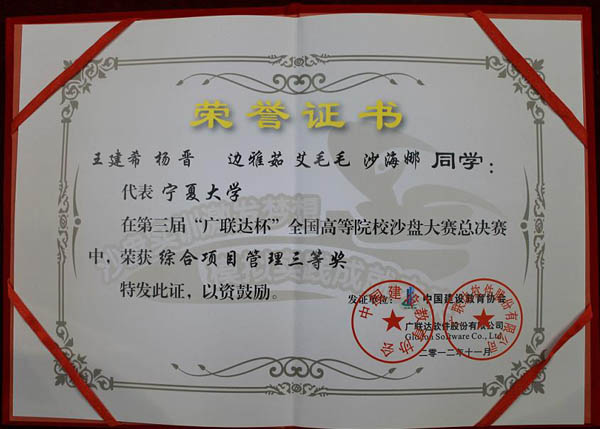 派出由张学科老师带队,2009级工程管理专业王建希和2010级工程管理专业杨晋、沙海娜、艾毛毛、边雅茹5名同学组成的代表队参加了比赛,经过1天白热化的角逐,获得综合项目管理三等奖,指导老师张学科获“优秀指导老师”称号。
