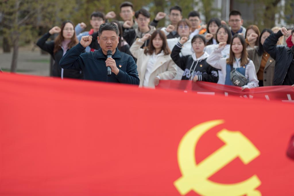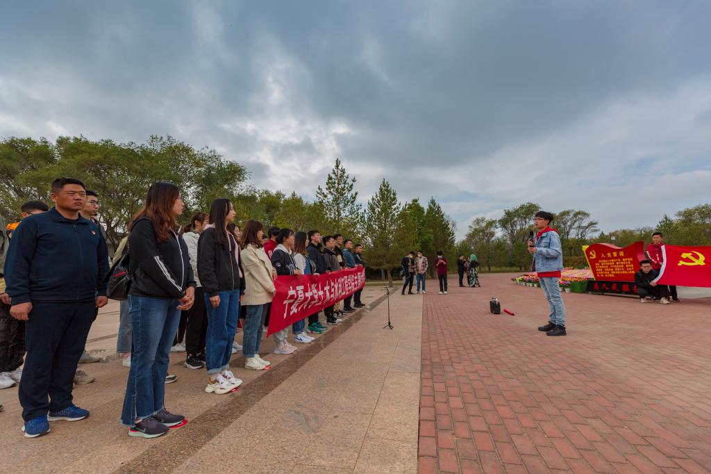 在盐池革命烈士纪念馆,土木本科党支部书记何涛带领全体党员面向党旗重温入党誓词。