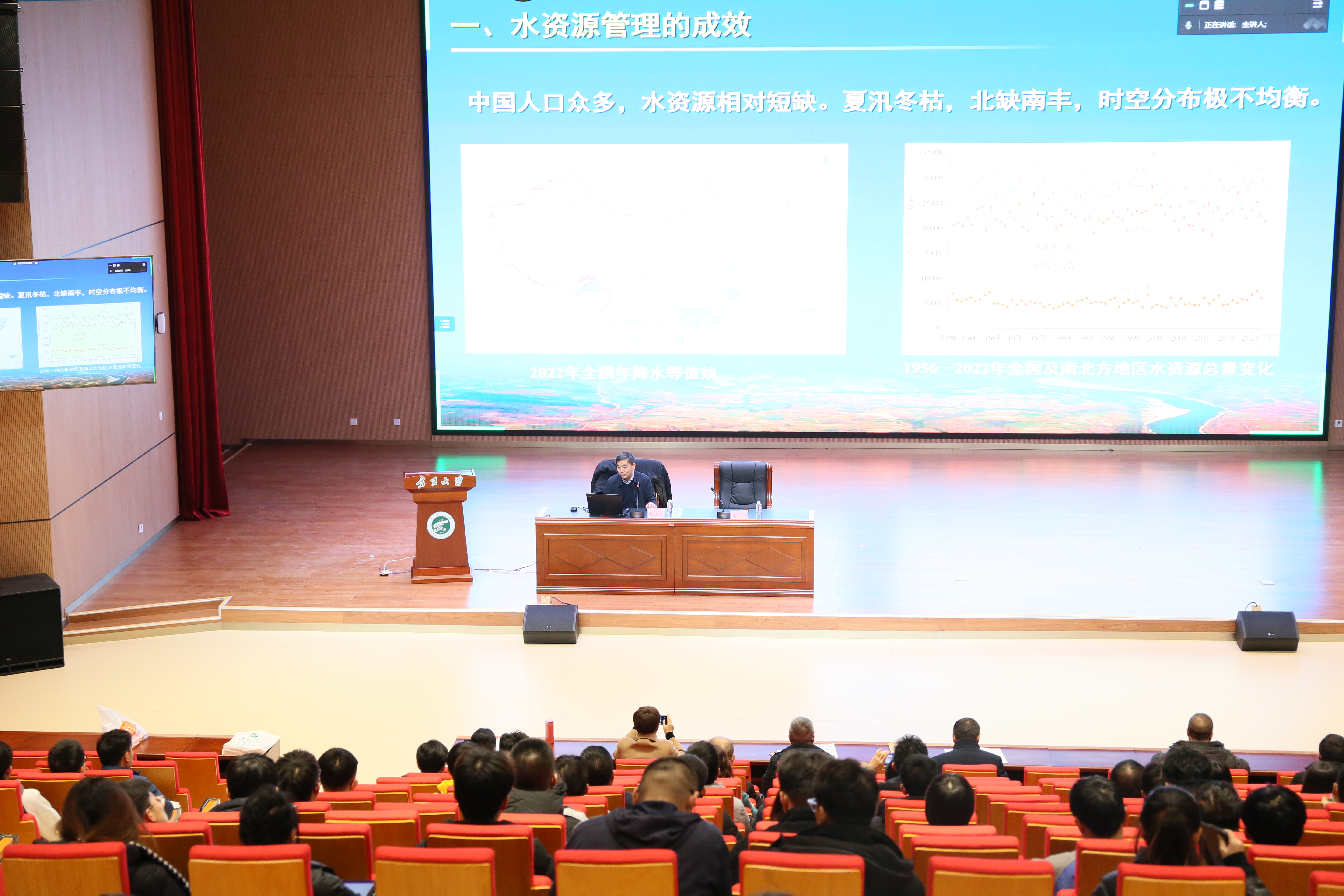 杨得瑞教授从水资源管理成效、水资源管理做法、水资源管理挑战、水资源管理展望四个方面对我国水资源管理现状进行了全面阐述。在讲座过程中,强调了在人口不断增长、经济快速发展、工业化城镇化快速推进的进程当中,保障供水安全并维系良好生态,平衡好经济社会发展用水和生态环境用水的意义;从强化水资源刚性约束、从严从细管好水资源、复苏河湖生态环境三个方面概括了我国水资源管理的做法;从有多少水、能用多少水、用了多少水、用的好不好四个方面分析了我国水资源管理存在的挑战;最终从提高供水质量和可靠性、保障河湖生态环境用水、推进实现地下水采补平衡三方面对我国水资源管理的进行了展望�