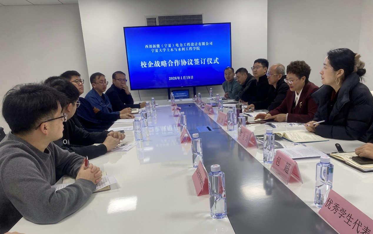 2026�1�19日上午,宁夏大学土木与水利工程学院与西部新能(宁夏)电力工程设计有限公司共同举办了实习实训基地揭牌仪式暨人才合作交流会议,在西部新能公司多功能会议厅顺利召开。本次会议以“深化产教融合,赋能人才培养”为主题,搭建校企协同育人平台,推动电力工程领域人才培养与产业需求紧密衔接。西部新能(宁夏)电力工程设计有限公司总经理周磊、商务总监陈睿、行政总监金久龙等企业负责人,与宁夏大学土木与水利工程学院党总支书记尹娟、副院长刘海峰,党总支委员/土木工程专业负责人车佳玲,土木系系主任包超,土木系、水利系、道桥系党支部书记吕龙龙、吴璞伟、许鹏及部分优秀学生代表共同出席了本次活动�