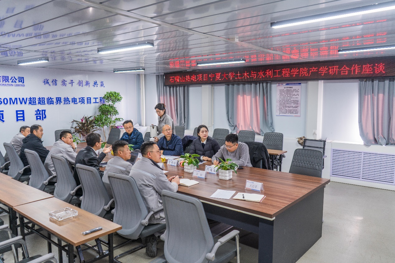 2026年2月2日上午,中电建宁夏工程有限公司石嘴山热电项目部与宁夏大学土木与水利工程学院产学研合作座谈会在宁夏电建项目部会议室顺利举行。本次座谈以“深化产教融合,赋能人才培养”为主题,推动校企资源共享、优势互补,共同探索产学研协同创新与人才培养新模式。中电建宁夏工程有限公司石嘴山热电项目部项目经理罗忠辉,项目党支部书记吾金平,项目副经理、总工程师马平及各相关部室负责人,与宁夏大学土木与水利工程学院副院长刘海峰,党总支委员/土木工程专业负责人车佳玲,土木系主任包超,土木系党支部书记吕龙龙共同出席了本次活动。