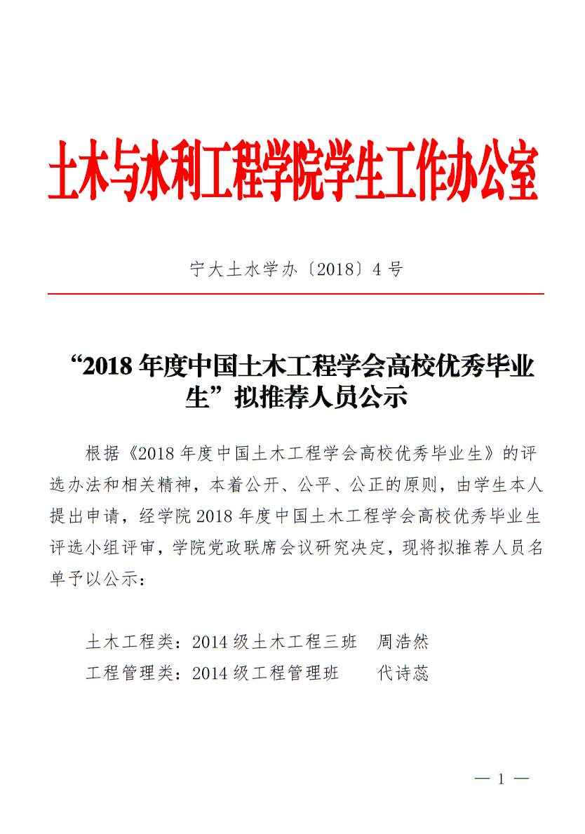 “全国水利院校第八届十佳未来水利之星”及“第十届全国水利优秀毕业生”拟推荐人员公示