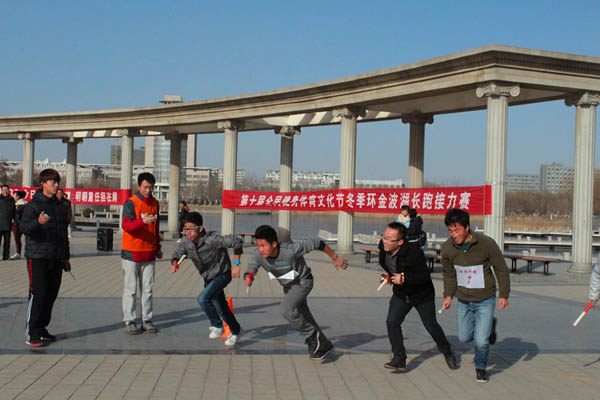 体育学院主办的“第十届全民健身体育文化节”系列活动之“冬季环金波湖长跑接力”的甲组比赛在成人漫画