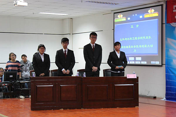、经管学院、政法学院及新华学院四个代表队过关斩将,登上“激情辩论,涤荡思想”辩论赛的决赛舞台。土水学院与新华学院就“新闻自由是不是推动社会改革的最大动力”展开激烈辩论,双方辩手你来我往,场下掌声不断,尤其是土水学子在提问环节表现突出,陈词内容条理清晰、言简意赅。自由辩论环节更是将辩论赛再次推向高潮,土水学院在本次辩论赛中获得优秀奖。