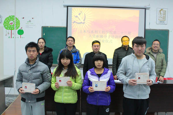 土水学院第二十三期入党积极分子培训于2014年10月29日开班,12月1日结业,历时33天,共有114名同学参加培训,通过专题讲座、观看视频、义务劳动、撰写心得及交流学习等多种形式对学员进行考核,共有78名同学顺利结业。