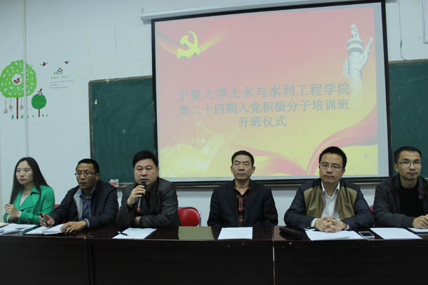 第二十四期入党积极分子培训班开班仪式在工科楼第三阶梯教室举行。学院党委书记马正亮老师,党委副书记王德全老师、张强老师,学办主任郭利老师,学院团委书记王娜老师,水利系党支部书记冯克鹏老师出席了此次开班仪式。