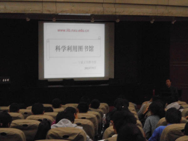 图书馆信息部主任陈晓波老师于B区逸夫楼图书馆报告厅为2013级新生举办“科学利用图书馆”的讲座。