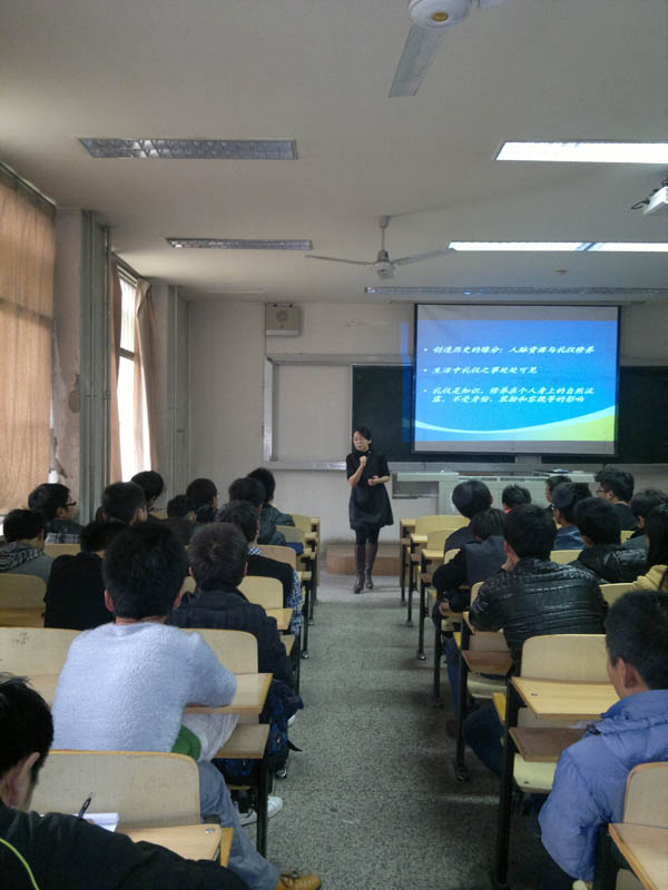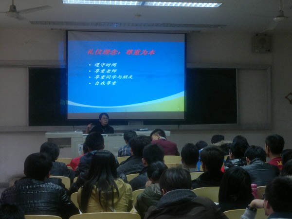 许丽君副教授通过例举自己、同事以及历史人物曹操的实例,阐述礼仪是知识、修养在个人身上的自然流露,不受身份、装扮和容貌等的影响这一道理,强调礼仪的理念是以尊重为本,希望大家要善于表达言行,做到行为规范。她幽默的话语调动了会场气氛,高雅的谈吐令大家心生敬佩。