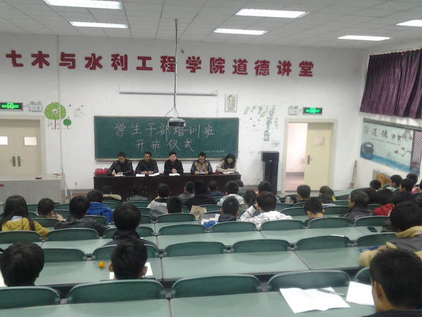 在阶3教室召开了学生干部培训仪式。会议由学办主任郭利主持,学办全体老师、各班班长和团支书、团委学生会副部级以上干部参会。开班仪式中,张强副书记首先介绍了本期学生干部培训方案。马正亮书记对学生干部提出了严格要求自己、强化责任心和团结协作意识等三点要求。