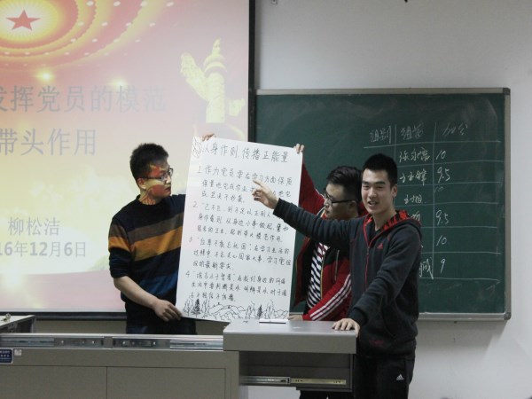 培训开始,柳书记组织同学们分为六个小组,并各自推选出代表对本组组员进行一一介绍。随后,柳书记用PPT向同学们讲授了“党的十八届六中全会精神”的相关内容,她强调:入党分子一定要端正入党动机,树立为人民服务的理念,将集体利益放在首位;大学生应纯化入党动机,通过学习实践,树立坚定的共产主义信念,牢记党的宗旨,将正确的动机融入到为人民服务的实践中去。紧接着,六个小组就“如何发挥党员的模范带头作用”展开了热烈的讨论和汇报,同学们争先恐后的发言,充分体现出了他们对党的宗旨的全面认知以及他们争做合格党员的决心与信心。最后,柳书记为同学们详细讲解了“五个带头”和“七个模范”的具体内容,她呼吁同学们:要发挥模范带头作用,就必须从小事做起,从自我做起,从身边的人做起,成为一名真正的党员、纯粹的党员!