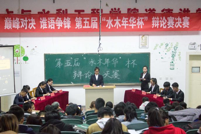 第五届“水木年华杯”辩论赛决赛在知行楼三阶教室顺利举行。党委副书记柳松洁,辅导员马小凤、蒋宇欢,外国语学院经验辩手王丹华、机械学院优秀辩手袁忆恒,土水学院优秀辩手郜英洲、吴哲,学院团委学生会主席团出席此次比赛,土木一班,土木二班,工程管理,农业水利四支队伍参赛。学院2017级同学观看此次比赛。