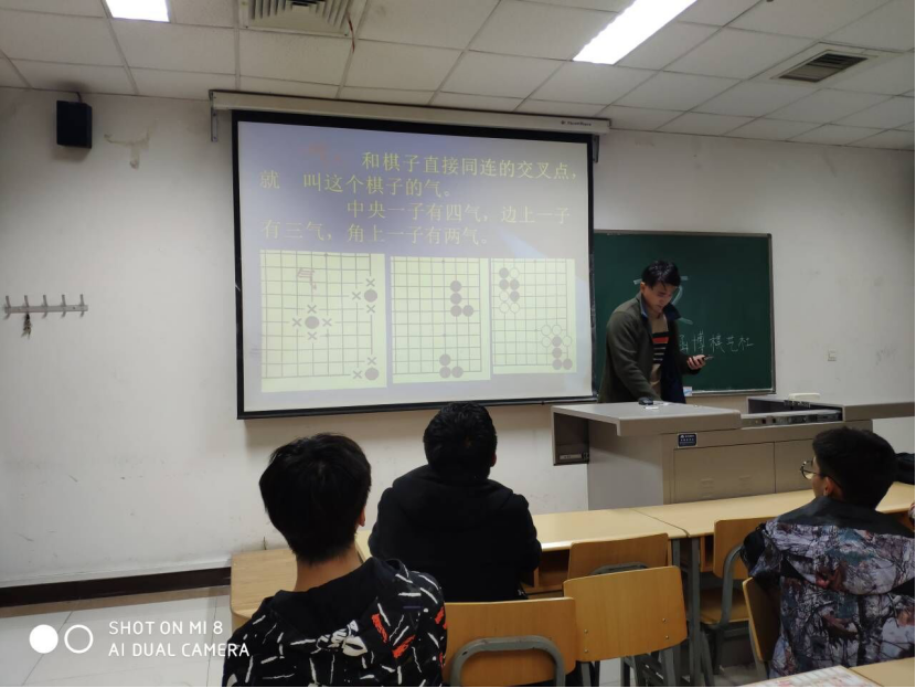 之后,棋队另一干将周子涵同学给大家带来了一堂围棋普及课。围棋相较中国象棋来说更为复杂、变化更多。周子涵同学在讲解过程中使用更通俗易懂的语言进行解释,讲的头头是道,足以体现出他扎实的围棋功底。在听课过程中,同学们尽管不甚明白,但也尽力去理解其中的奥妙。台上台下还时不时地进行一些互动,整个教室营造出了一派“棋”乐融融的氛围。
