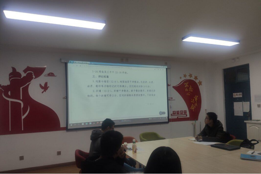 会议中连泽立首先对前几周所有干事检查卫生出现的问题进行点评。然后提出对被评分的宿舍人员提出的疑问不能及时解答的问题,所有干事应对自己出现的错误进行反思并整改。最后,连泽立要求检查宿舍卫生时,第一印象先观察其整洁度,优秀宿舍整洁度必然优秀,且在检查卫生的过程中,当有人提出疑问,干事需态度明确,有理有据,不轻易说出“挺好的”、“没什么大问题”等含糊不清的词。