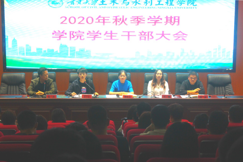 党委副书记柳松洁、学生工作办公室主任王娜、团委学生会指导老师蒋宇欢、2020级辅导员何涛老师、学生工作办公室老师徐浩和学院全体学生干部。会议由蒋宇欢主持。