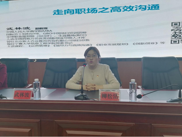 于2020年11月12日晚7点在知行楼三阶举行“大学生职场沟通”讲座。讲座由学院党委副书记柳松洁主持,信息工程学院党委书记武林波教授主讲,2016、2017级同学参加了此次讲座。