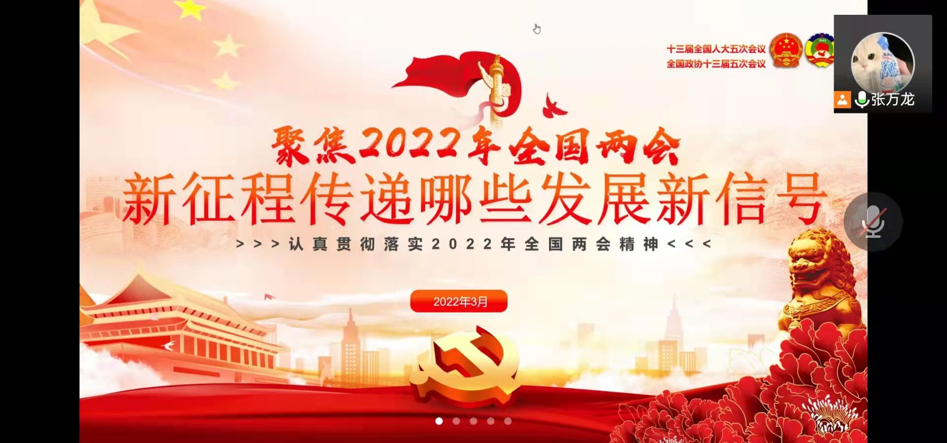 2022�3�19日晚,交管本科党支部线上召开2022年全国两会专题学习。参加此次会议的有党员以及预备党员共30人。本次会议由张万龙同志主持召开,围绕中国人民政治协商会议第十三届全国委员会第五次会议的内容以及会议将释放哪些中国发展的信号展开,本次的学习会从以下四个部分进行介绍�