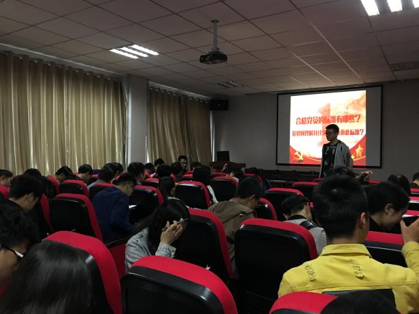 首先,郜英洲同学提出“合格党员的标准有哪些?你如何理解并计划怎样靠近此目标?”这一问题并希望培训班成员能够紧密联系生活实际,以具体事例来讨论此问题。2017级工程管理班彭锐同学认为:合格的党员应该对于“四讲四有”有更加深入的了解,以此为契机约束自身道德行为规范,起着模范带头作用。在分享过程中,培训班成员也多次提到学生党员进行的学业辅导就是合格党员应该主动承担的一项责任。接下来,郜英洲同学又提出了“你认为你身边党员的哪些表现起到了模范带头作用?”这一问题,培训班成员争先发言,多次引用辅导员老师、优秀学长学姐以及父母的言行进行举例,发表个人见解。